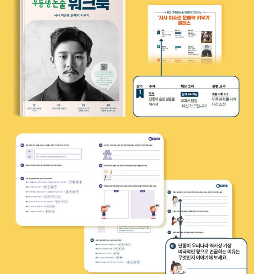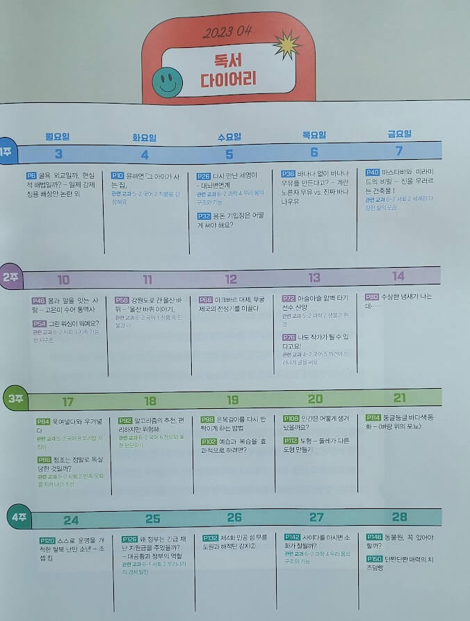 . 구성 : 기사 매거진 (독서, 체험, 시사, 글쓰기) 158쪽 + 책 속 워크북(매달 새로운 주제와 연관된 서술. 논술형 문제)