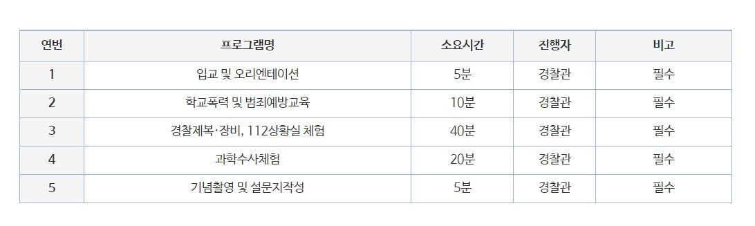 - 학교 폭력을 예방하고 건강한 성장을 위해 어린이와 청소년을 대상으로 경찰 체험 프로그램을 진행한다