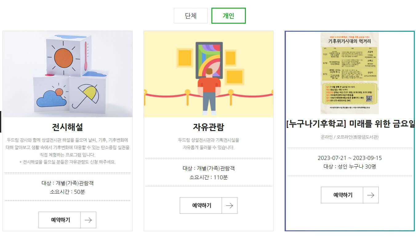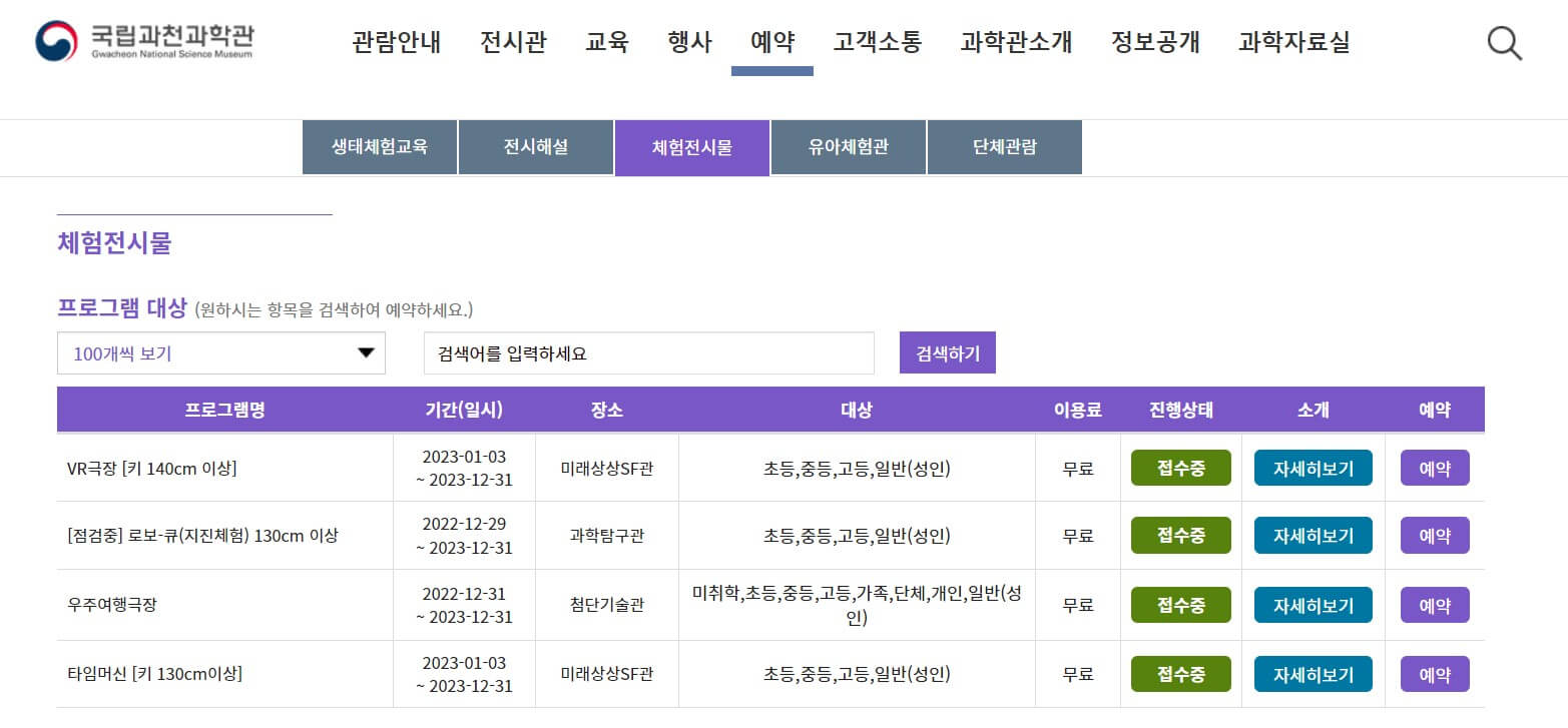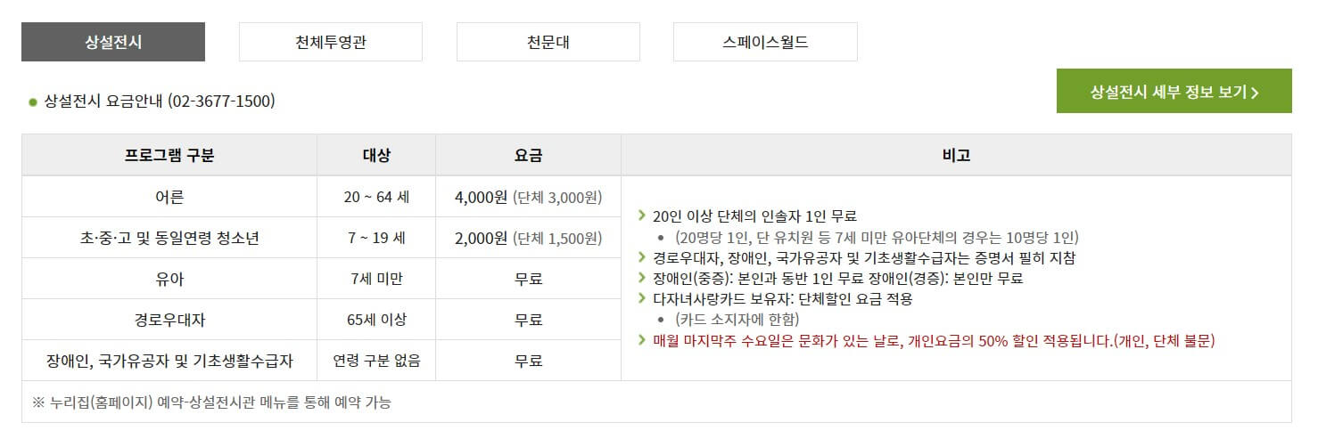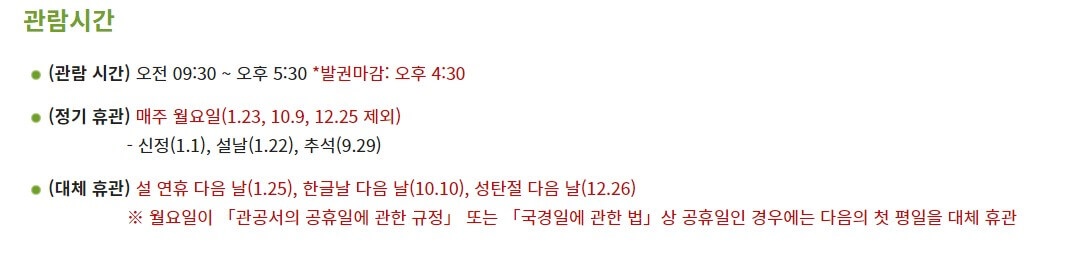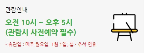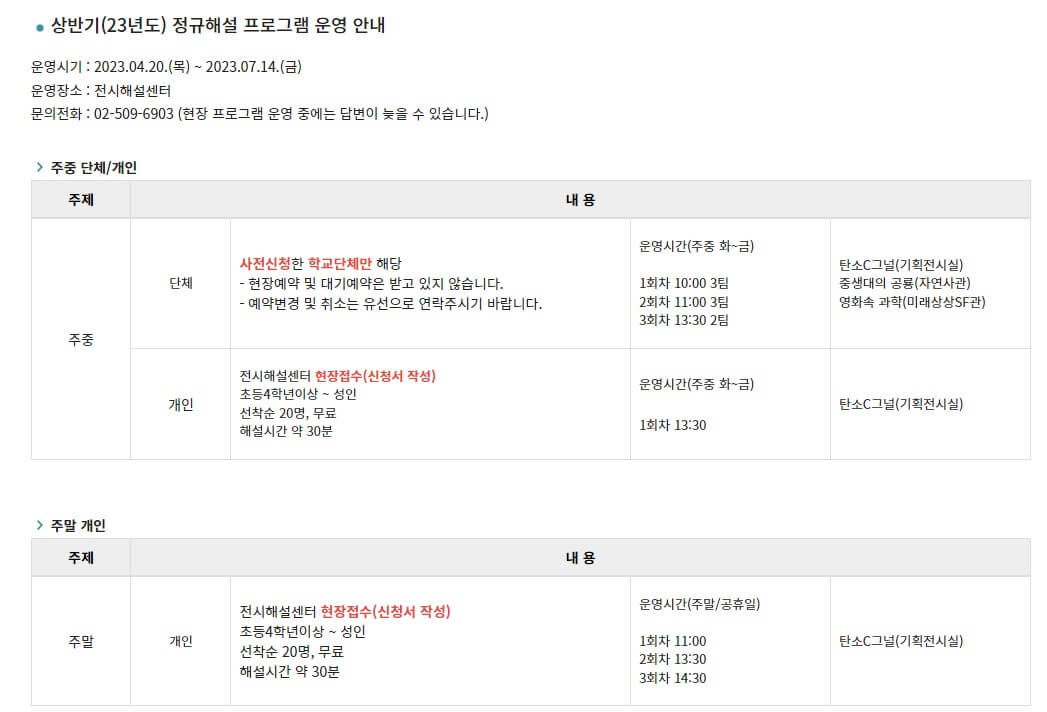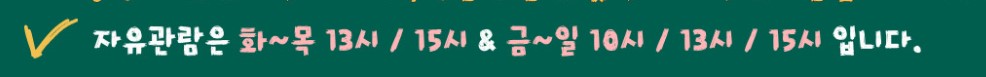- 체험 예약 : 관람일 3일전 밤 9시부터 예약 가능/ 일부 프로그램은 예약 시간 상이
