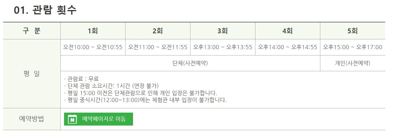 평일에만 운영되며 개인 관람은 오후 3시부터만 가능하다