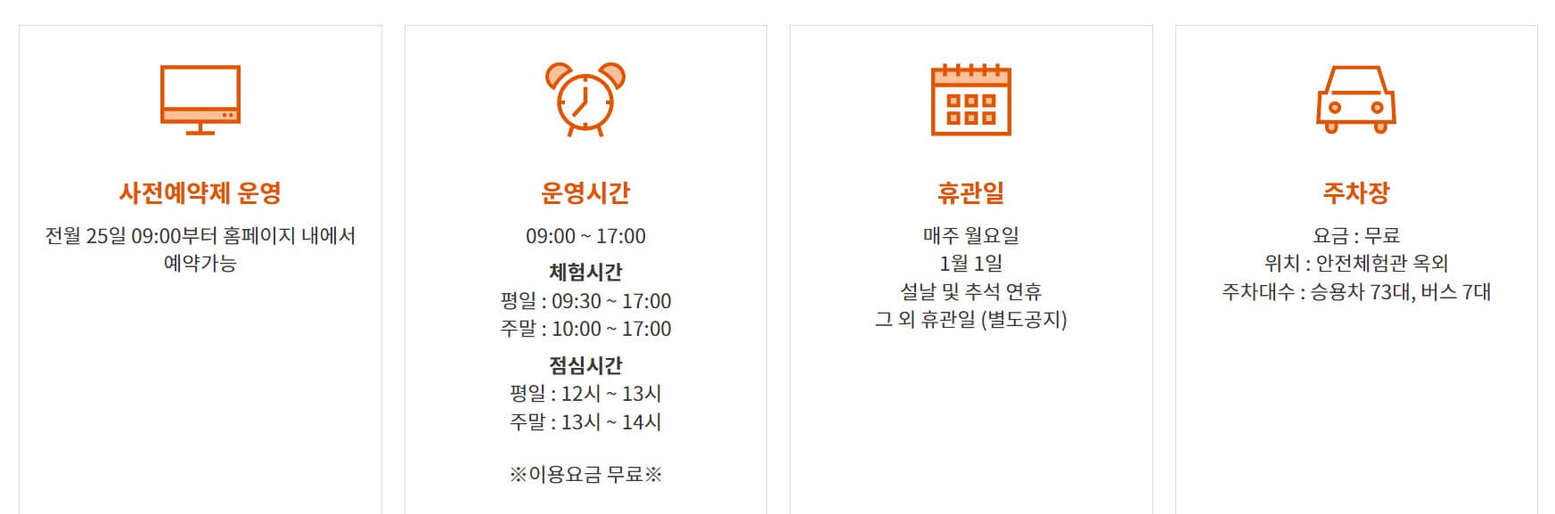 - 운영시간 및 주차 : 전달 25일 9:00부터 에 다음달 체험 예약 가능