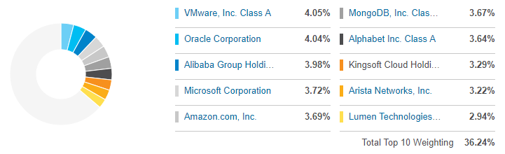 - 우리에게 익숙한 소프트웨어, 클라우드 관련 기업이 랭킹되어 있다. 상위 10개 종목의 비중이 36% 수준으로 상위 특정 종목에 대한 비중을 높게 태우지는 않는다. 종목별 4% 내외.