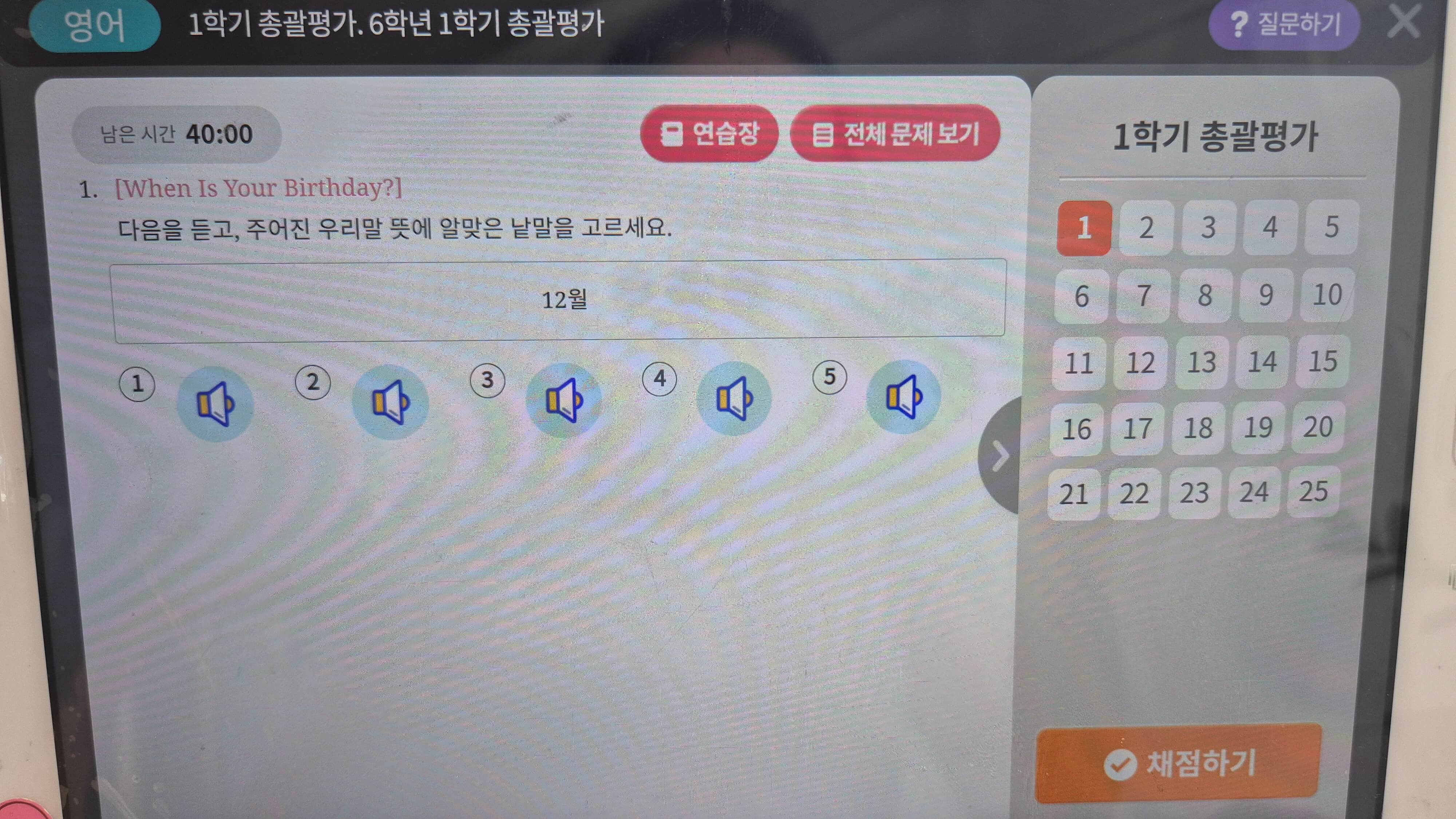 국어, 영어, 수학, 사회, 과학 총 5개의 주요 과목 총괄평가를 하루에 2개씩 진행하고 있답니다.