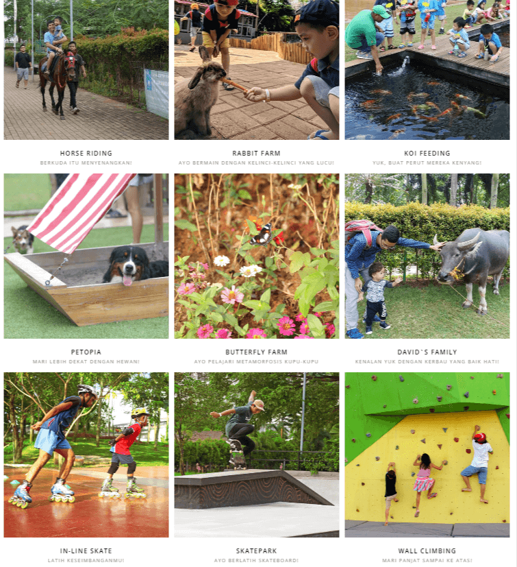 체험 코스로는 암벽등반, 말타기, 토끼농장에서 밥 주기, 물고기 먹이주기,