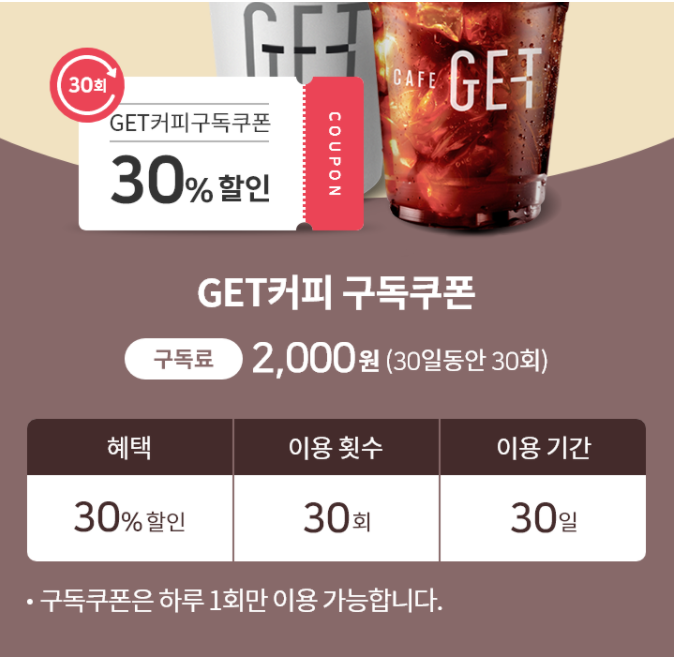 - 던킨 : 월 29,700 원으로 아메리카노를 매일 한잔씩 30잔 마실 수 있다. 300원 추가 시 라테로 변경 가능 (한 잔 990원)
