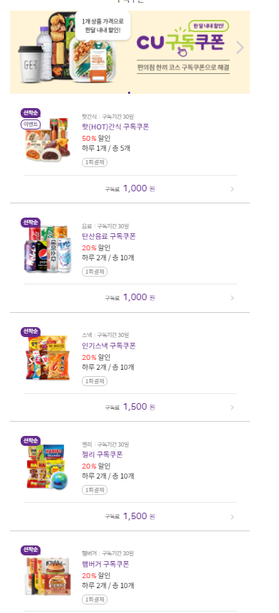 - 포켓 CU앱을 설치한 후 할인받고 싶은 상품 카테고리를 선택한 후 구독료를 결제하면