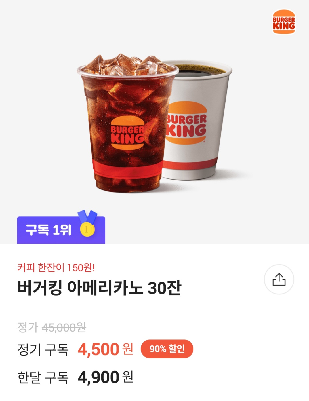 커피 구독은 정기 구독(월 4,500원)과 한 달 구독(월 4,900원)료로 아메리카노 30잔을 마실 수 있다(한잔 150원)