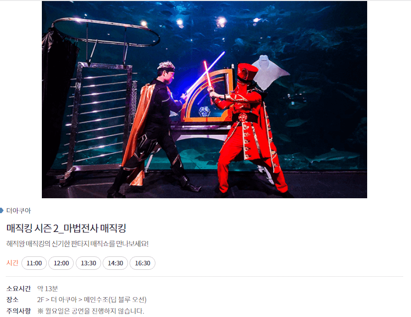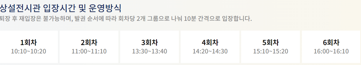 . 이용시간 : 발권 순서에 따라 회차당 2개 그룹으로 나눠 10분 간격으로 입장/ 90분 관람