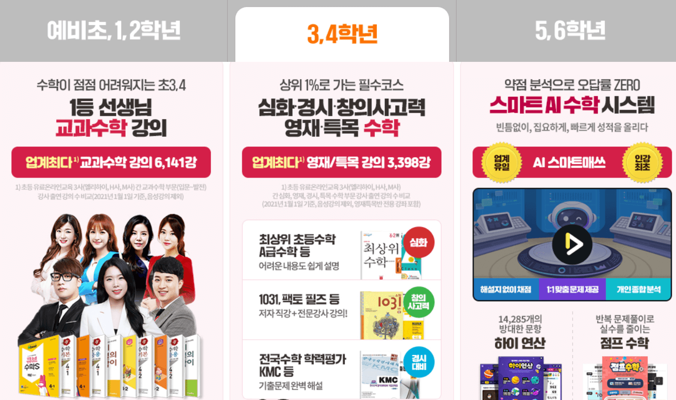 교과과정뿐만 아니라 심화, 경시, 영재, 특목 강의를 따로 제공해서 상위권 학생들의 니즈를 충족