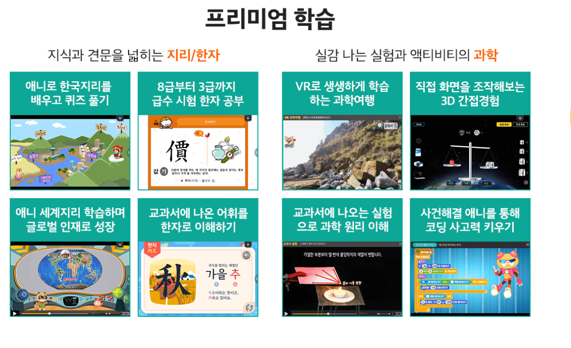 수행평가, 예체능, 코딩, 한자 , AR 관찰 등의 콘텐츠와 Who 시리즈와 한국사, 세계사 등의