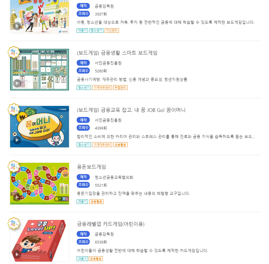 ③ 콘텐츠 한눈에 -> 체험형 교구 : 연령에 맞는 금융 보드게임이나 카드 게임 등을