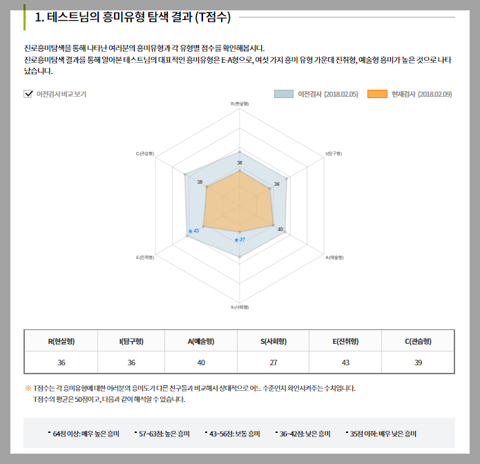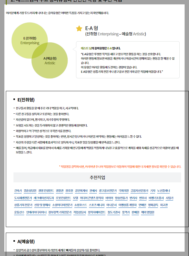 진로적성검사 결과지를 추천 직업과 함께 제공한다