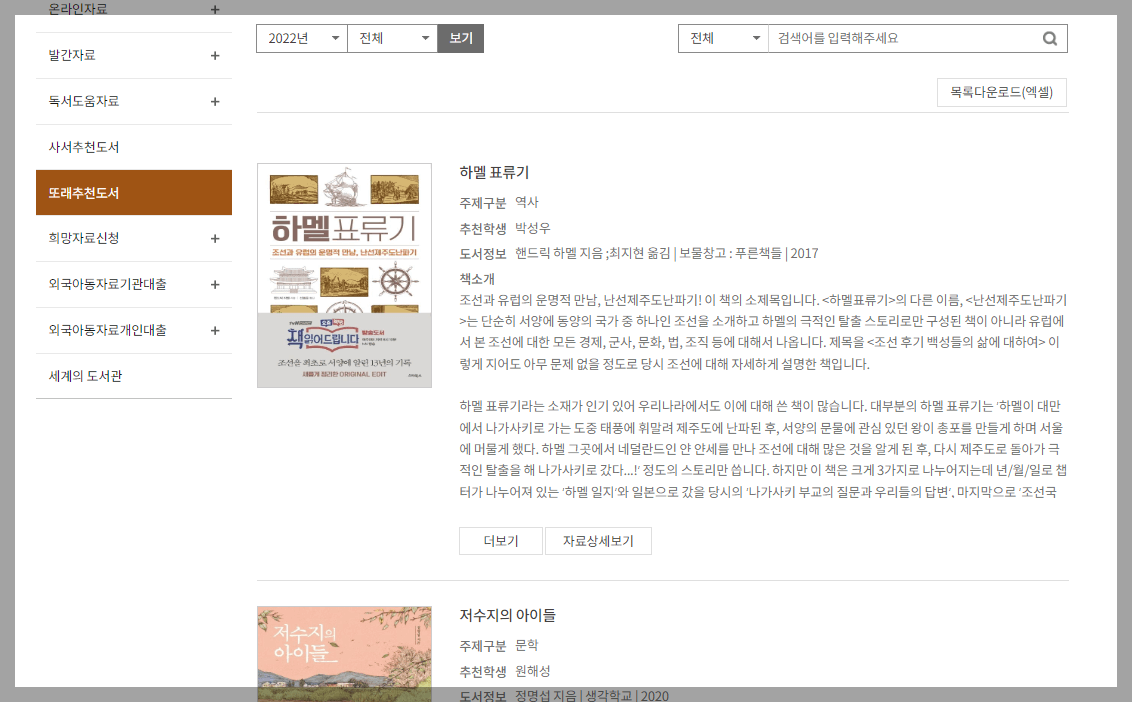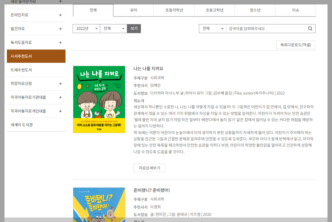 ① 자료검색 -> 사서추천도서 : 국립 어린이 청소년 도서관 사서들이 발행 6개월 이내의 신착도서 중에서