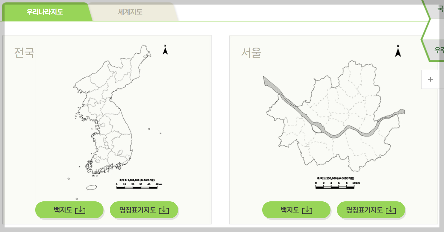 ② 지도 백과 -> 지도 다운로드 : 명칭이 표기되지 않은 백지도와 지역 명칭이 표기된 지도를