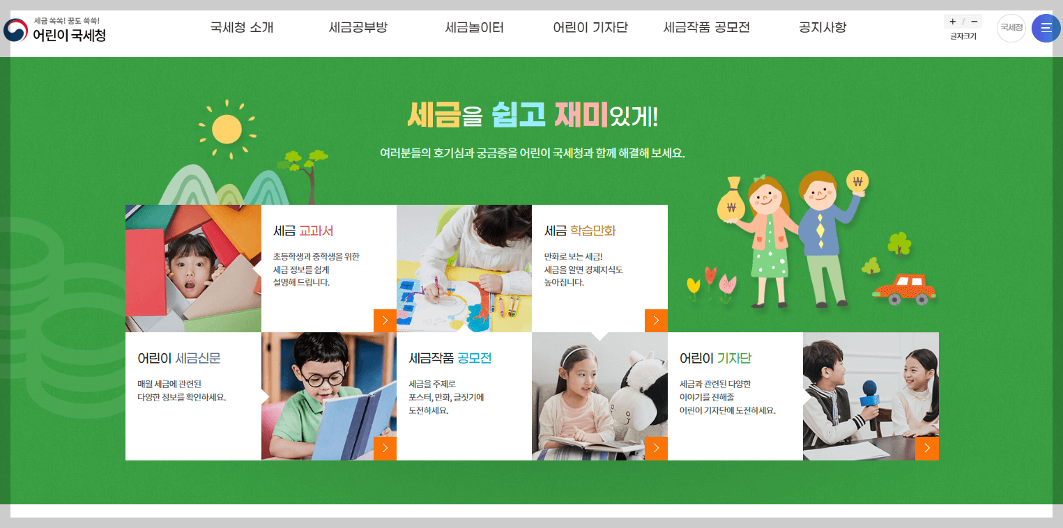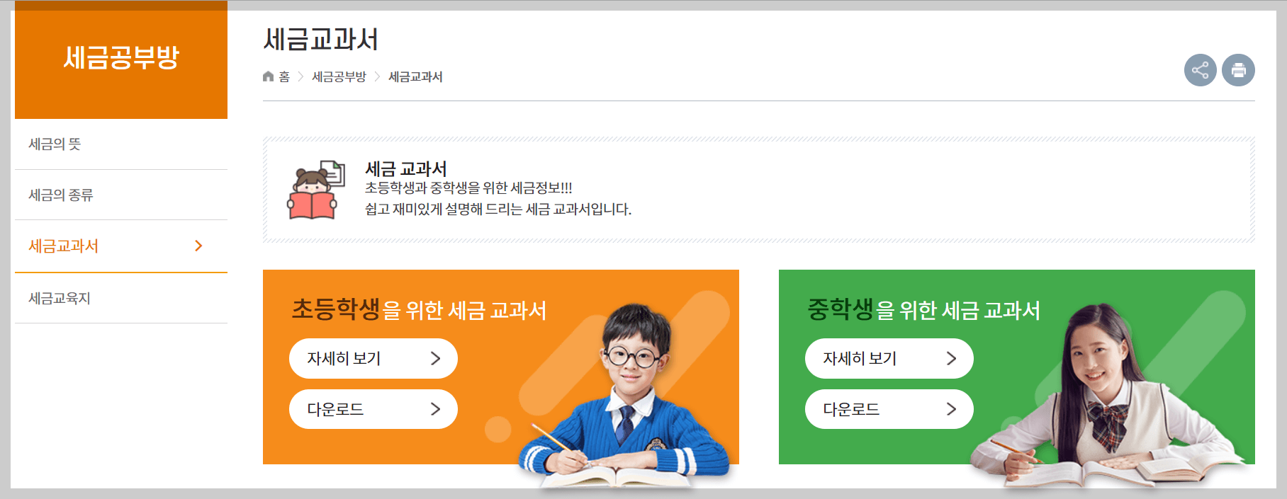 ① 세금 공부방 -> 세금교과서 : 초등학생과 중학생을 위한 세금정보를 재미있는 만화 형식으로 설명하고
