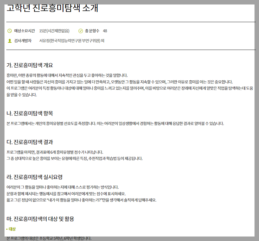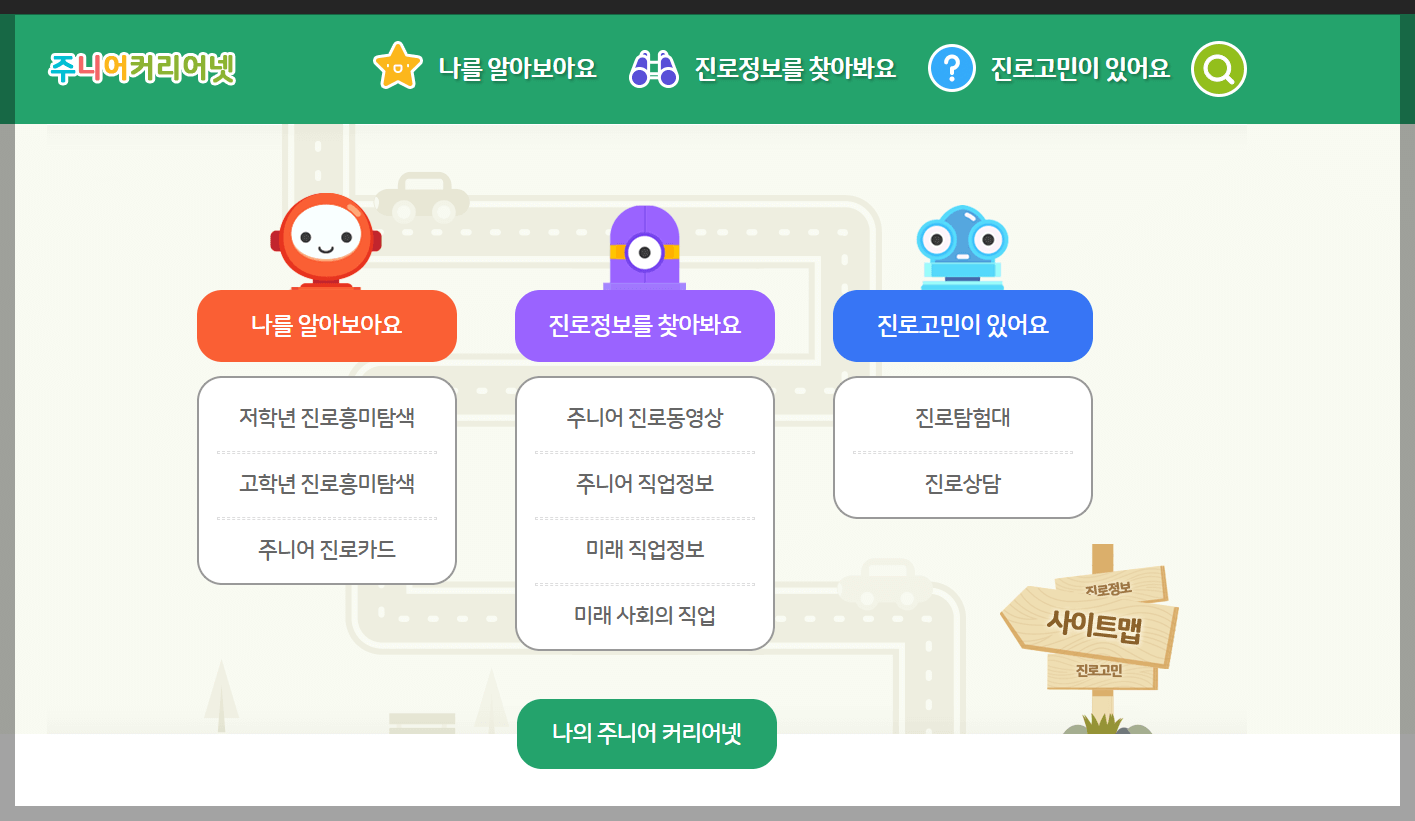 초등학생은 주니어커리어넷이란 사이트로 이동해서 진행하게 된다