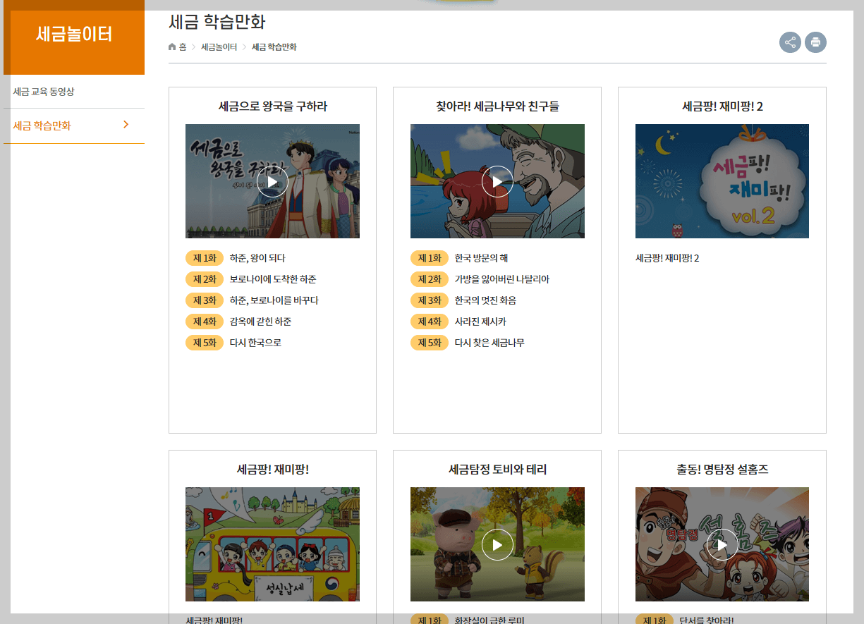 ② 세금 놀이터 -> 세금학습만화 : 세금에 관한 내용을 시리즈별로 학습 동영상 만화로 구성하여