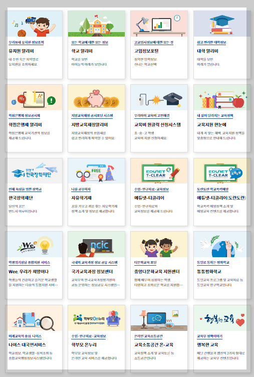 (유치원 알리미/ 학교알리미/ 대학알리미/ 자유학기제/ 에듀넷 티 클리어/ 국가교육과정정보센터 등)