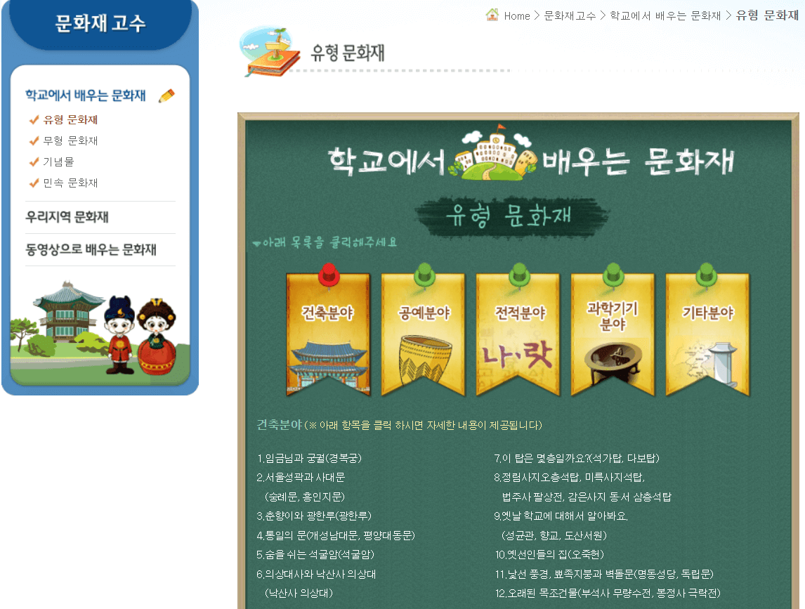 학교에서 배우게 되는 다양한 종류의 문화재(유형, 무형, 기념물, 민속) 대해서