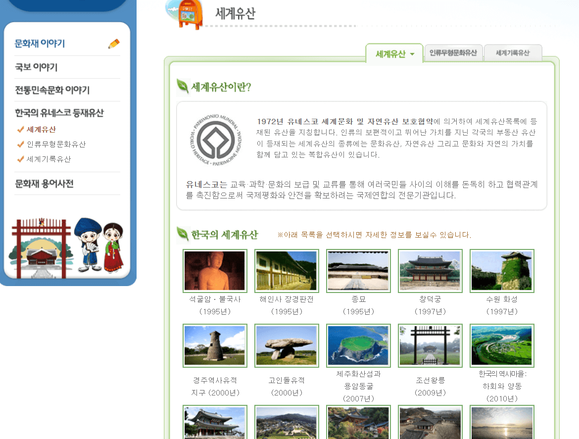 한국의 유네스코에 등재된 유산들에 대해서도 찾아볼 수 있다