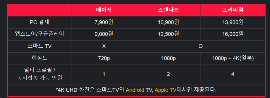 - PC결제와 모바일 결제금액이 다른 것이 특징적/ 요금제에 따라 최대 1~4명까지 동시 접속 가능