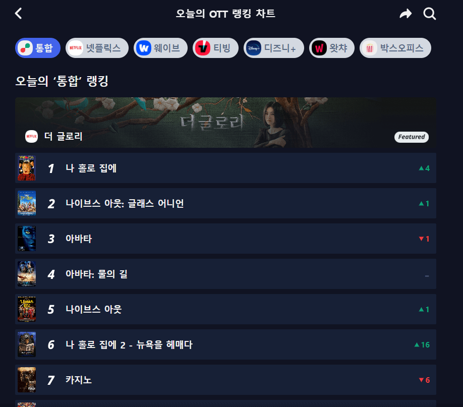 또한 플랫폼별로 매일의 영화,드라마 인기순위(데일리랭킹차트)를 볼 수 있어