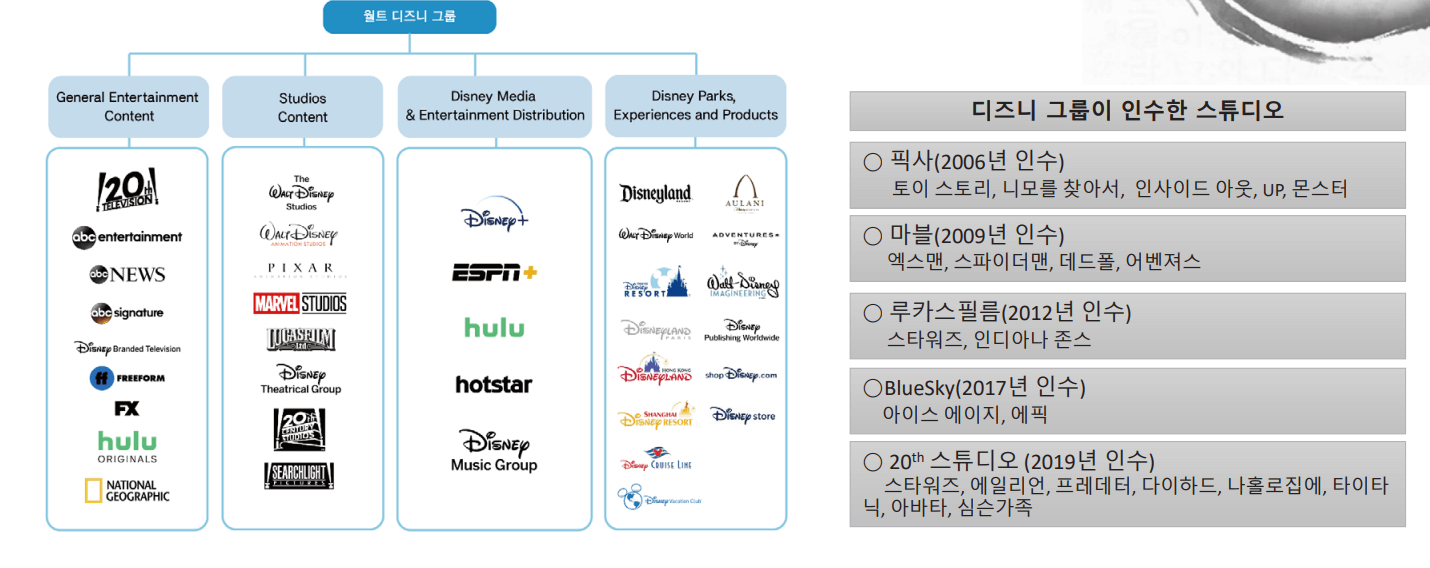 - 대표 콘텐츠 : 디즈니. 픽사애니메이션(겨울왕국, 모아나, 주토피아등) , 마블 유니버스, 내셔널 지오그래픽 시리즈