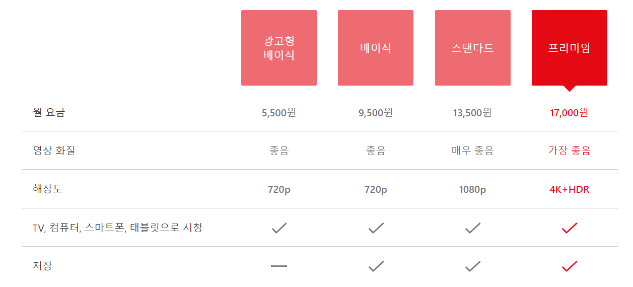 - 프리미엄 멤버십은 동시접속 4명, 스탠더드는 2명, 베이식이나 광고형 베이식은 1명까지 가능
