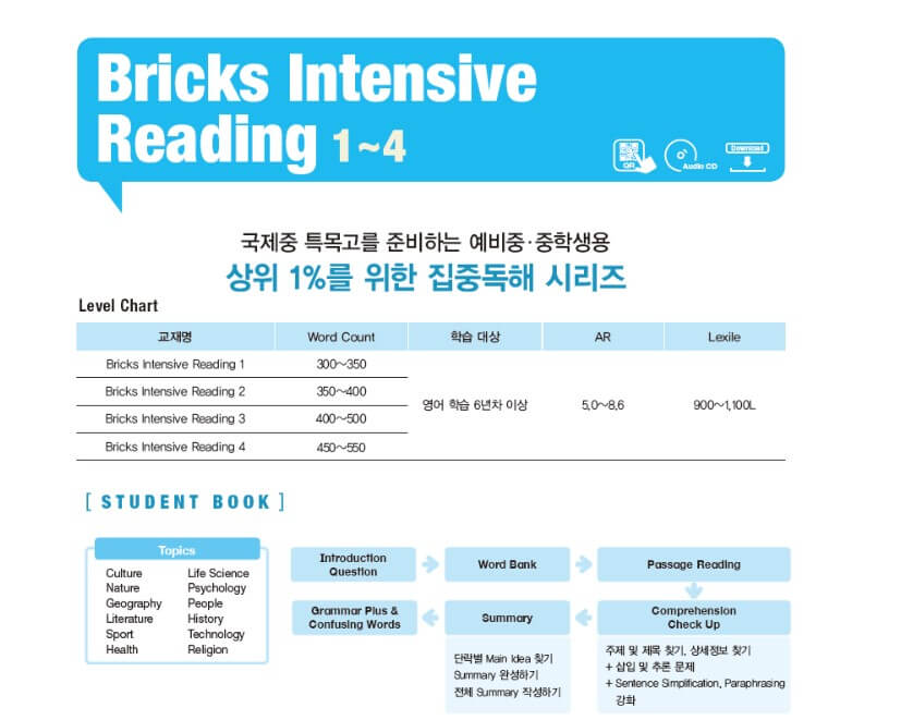 ● 인텐시브 리딩(Lexile 900~1100) - 국제중, 특목고를 희망하는 예비중학생과 중학생을 위한 고급 수준의 리딩교재